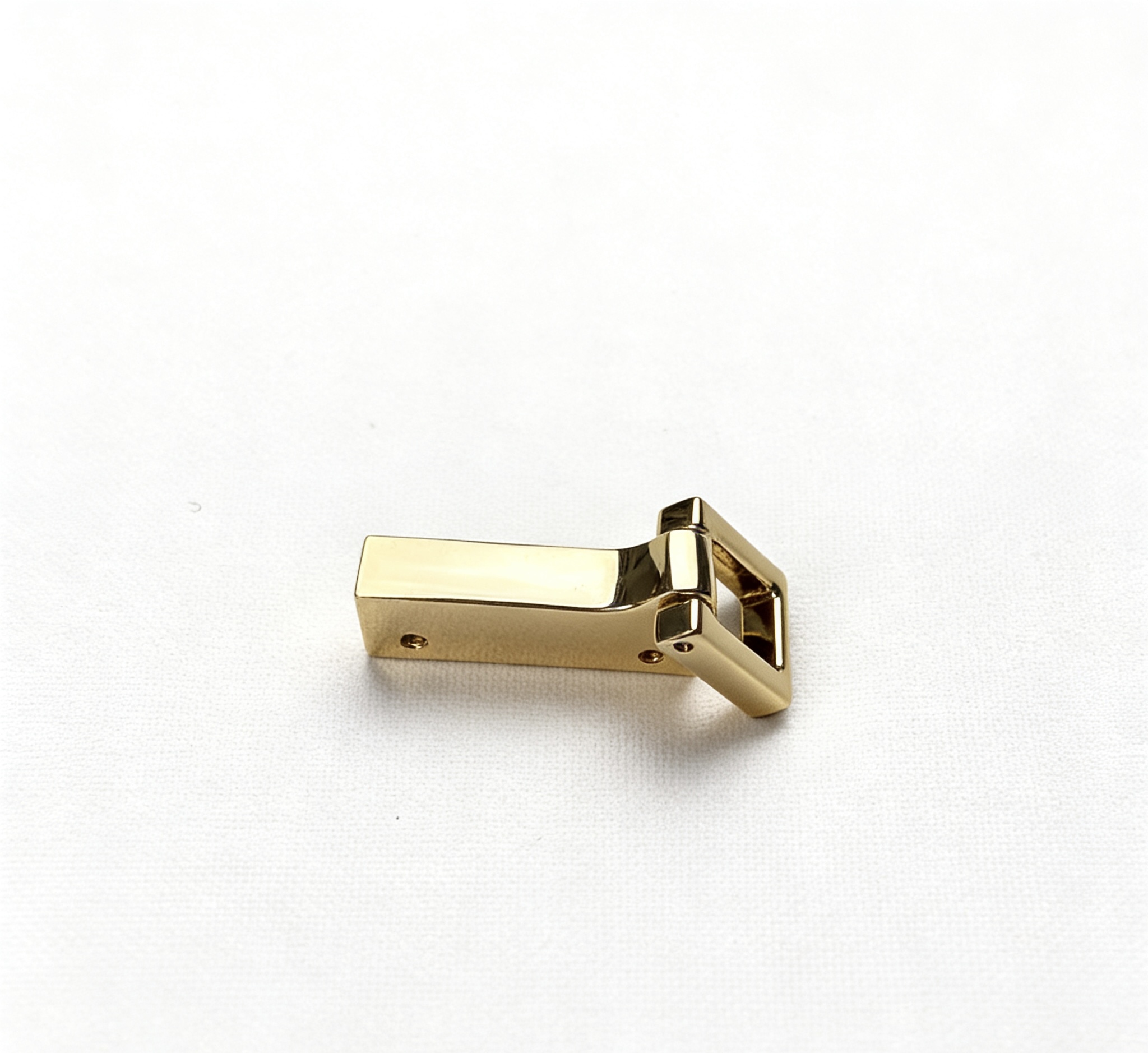 When designing structured briefcases, heavy travel duffels, or elegant top-handle bags, static hardware often forces the handles to remain rigidly upright, disrupting the bag’s silhouette when resting. Our articulated hinged strap anchor solves this beautifully. Engineered with a precision-machined joint, this connector allows heavy leather handles to fold down smoothly and lay flat against the bag’s body. Finished in a breathtaking, jewelry-grade light gold, it serves as both a mechanical marvel and a stunning visual focal point.